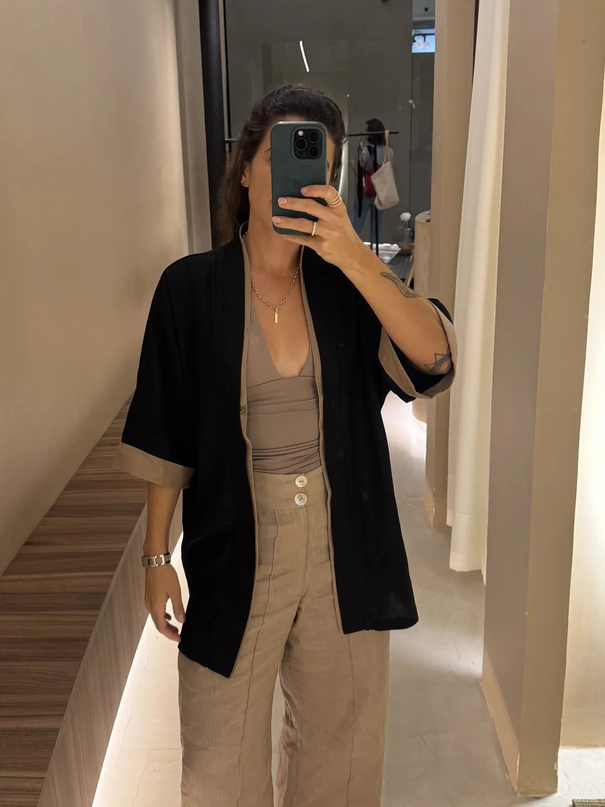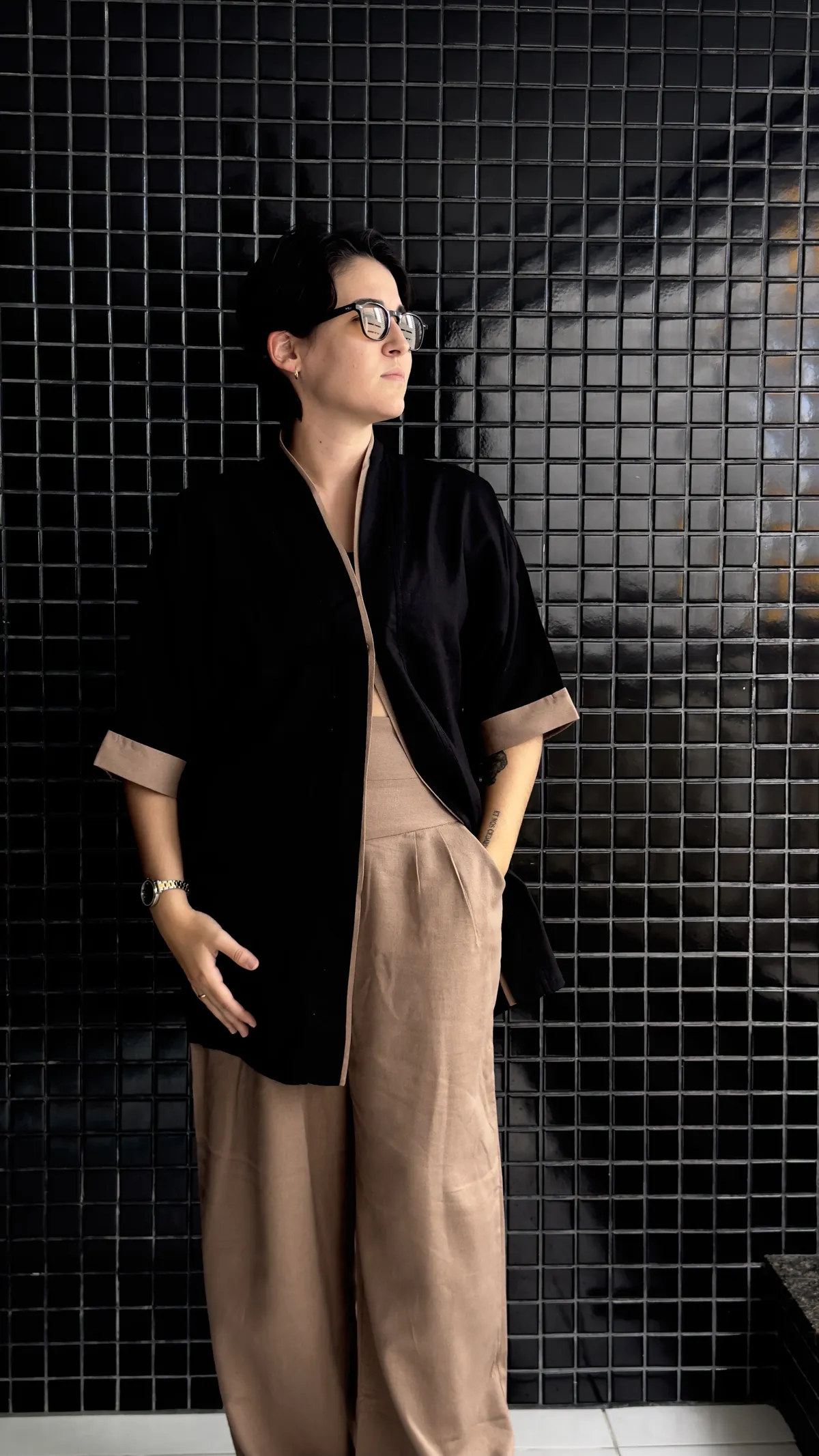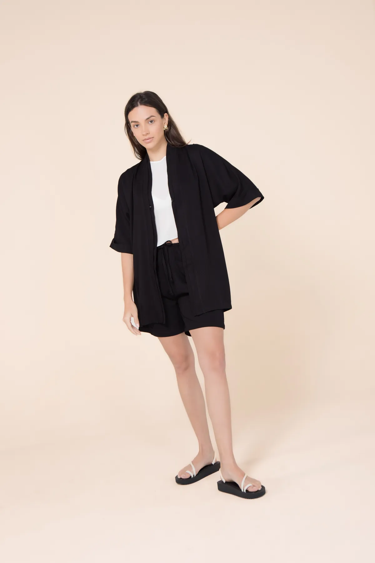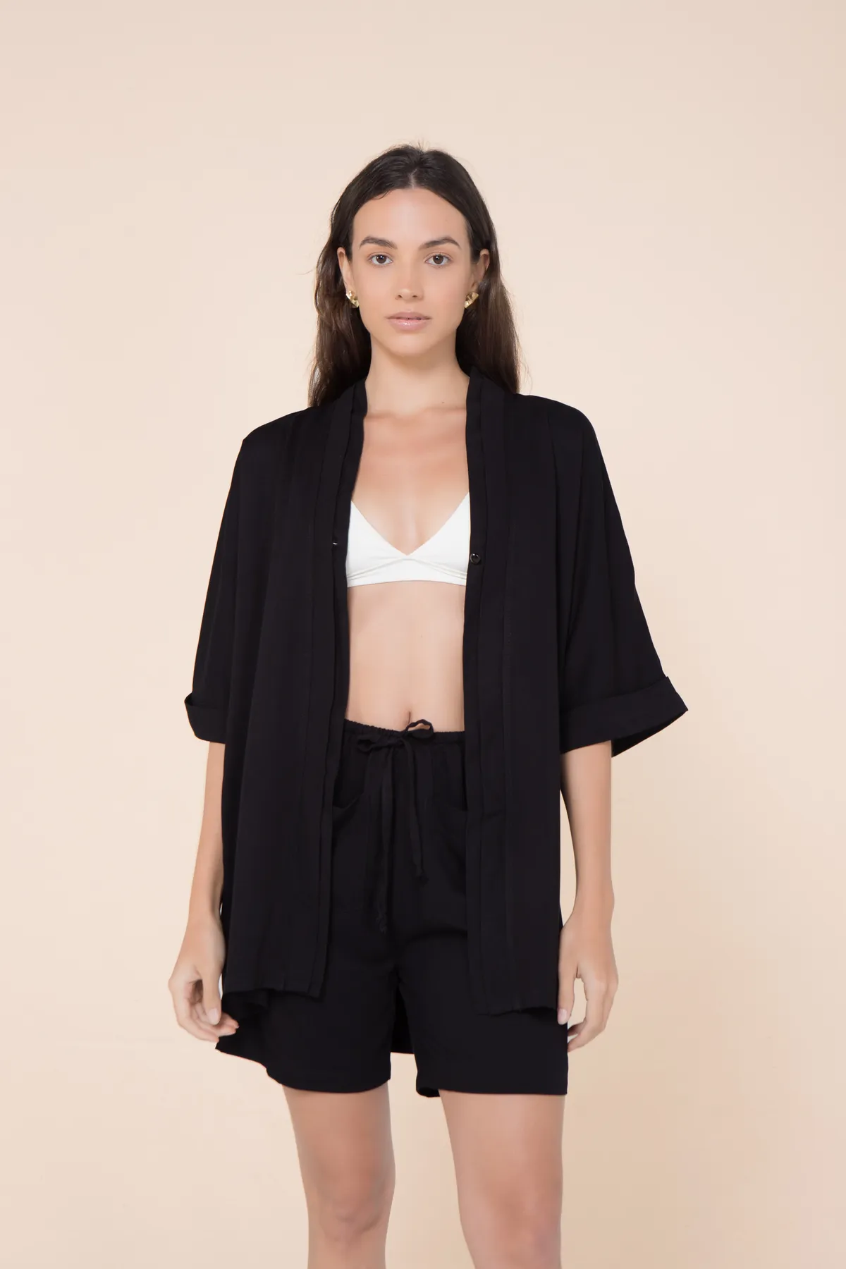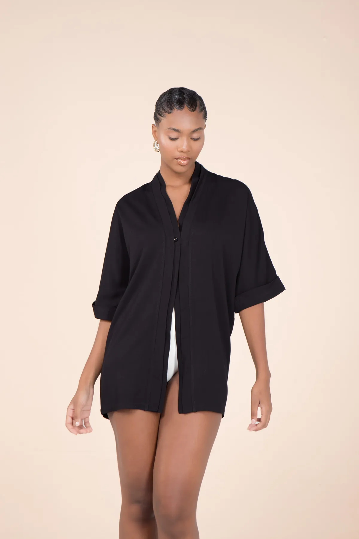 Camisa em modelagem moderna de kimono, oversized, com botão único perolado no tom da peça. A gola dupla se estende ao longo da peça. Despojada com sofisticação.