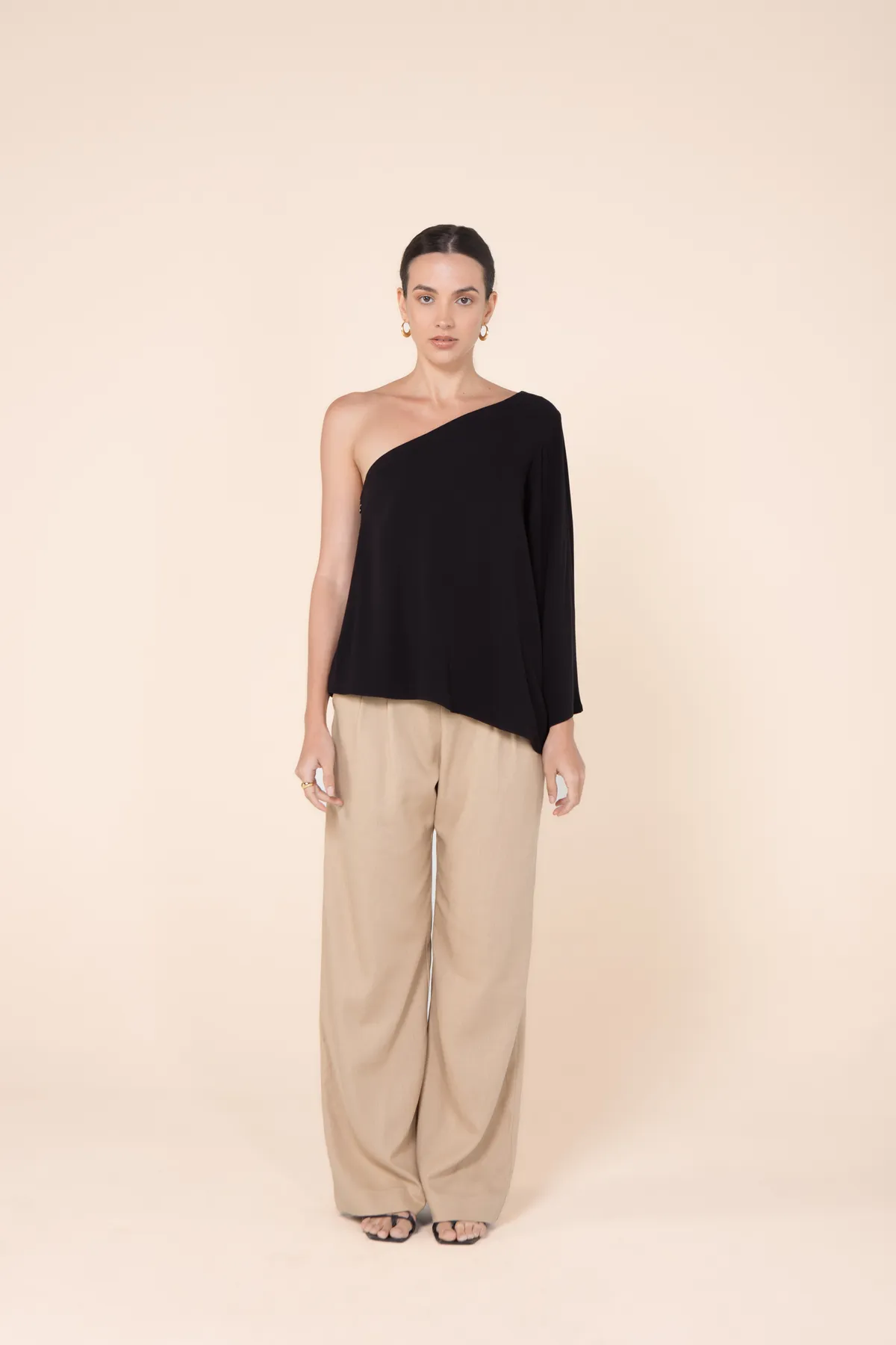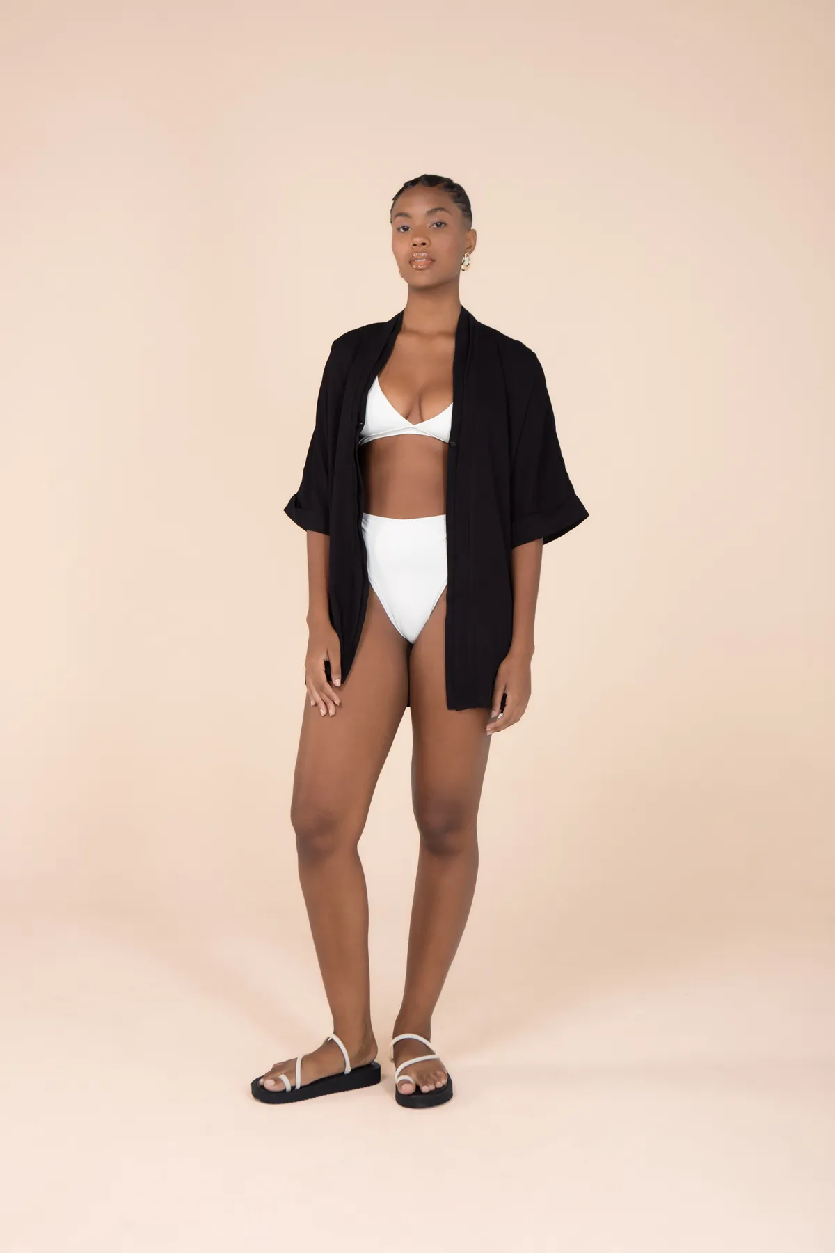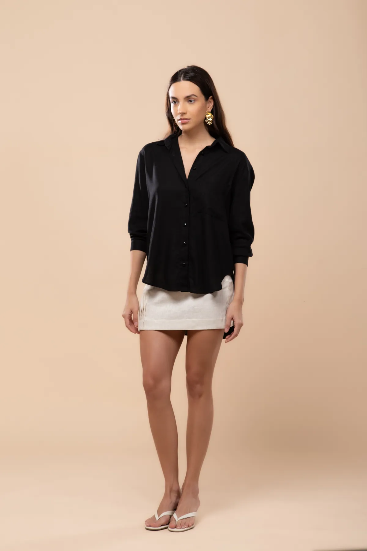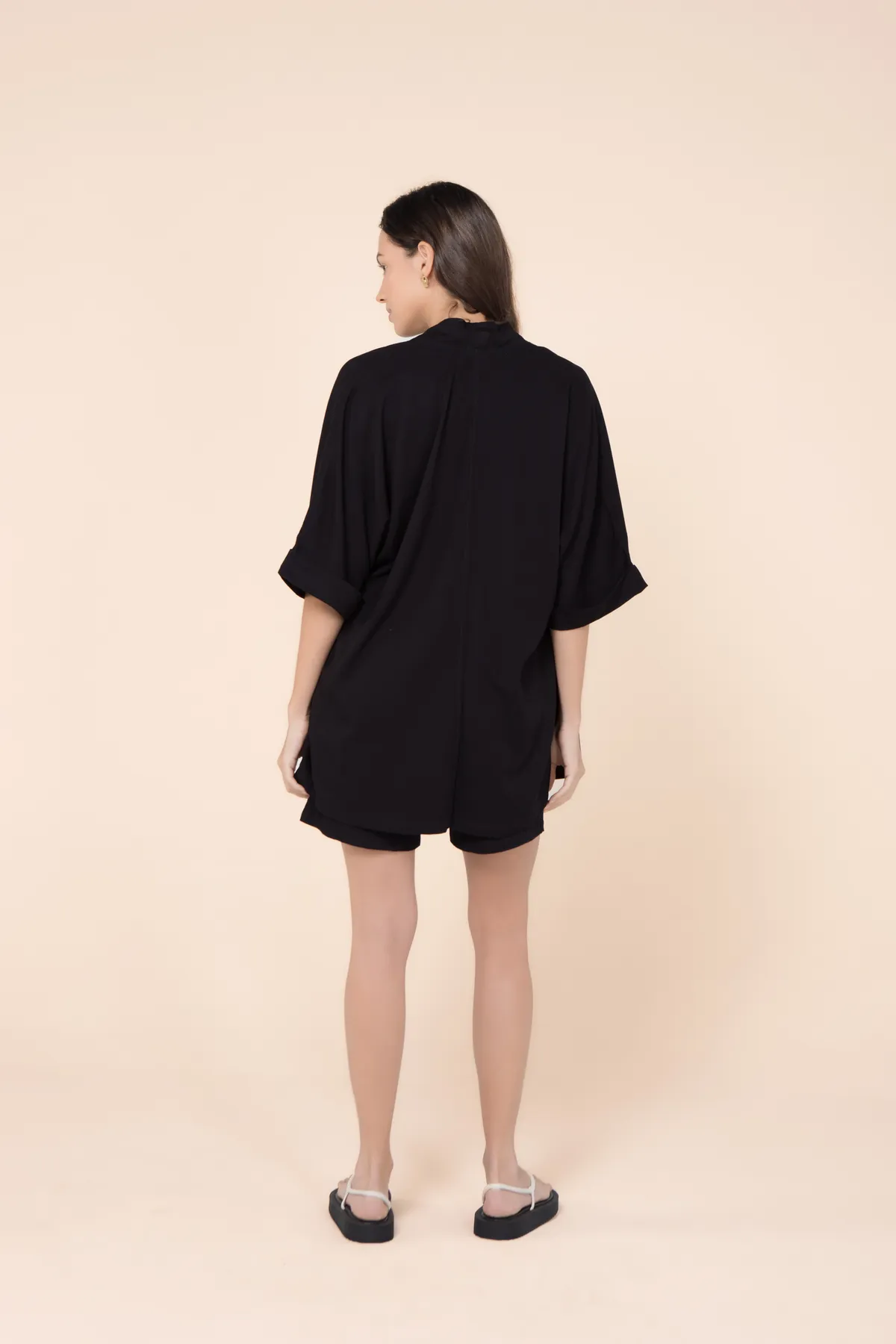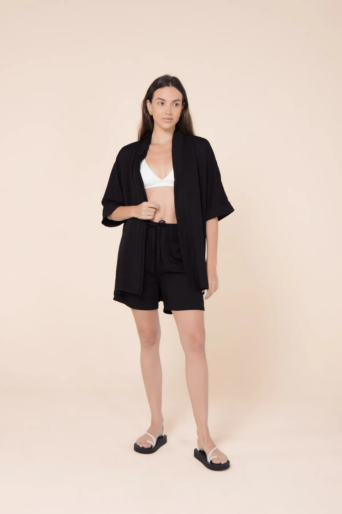 Camisa em modelagem moderna de kimono, oversized, com botão único perolado no tom da peça. A gola dupla se estende ao longo da peça. Despojada com sofisticação.