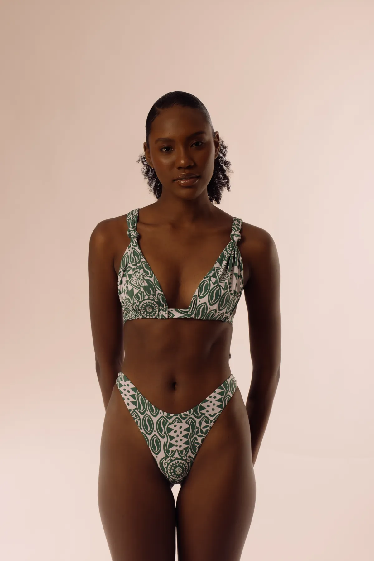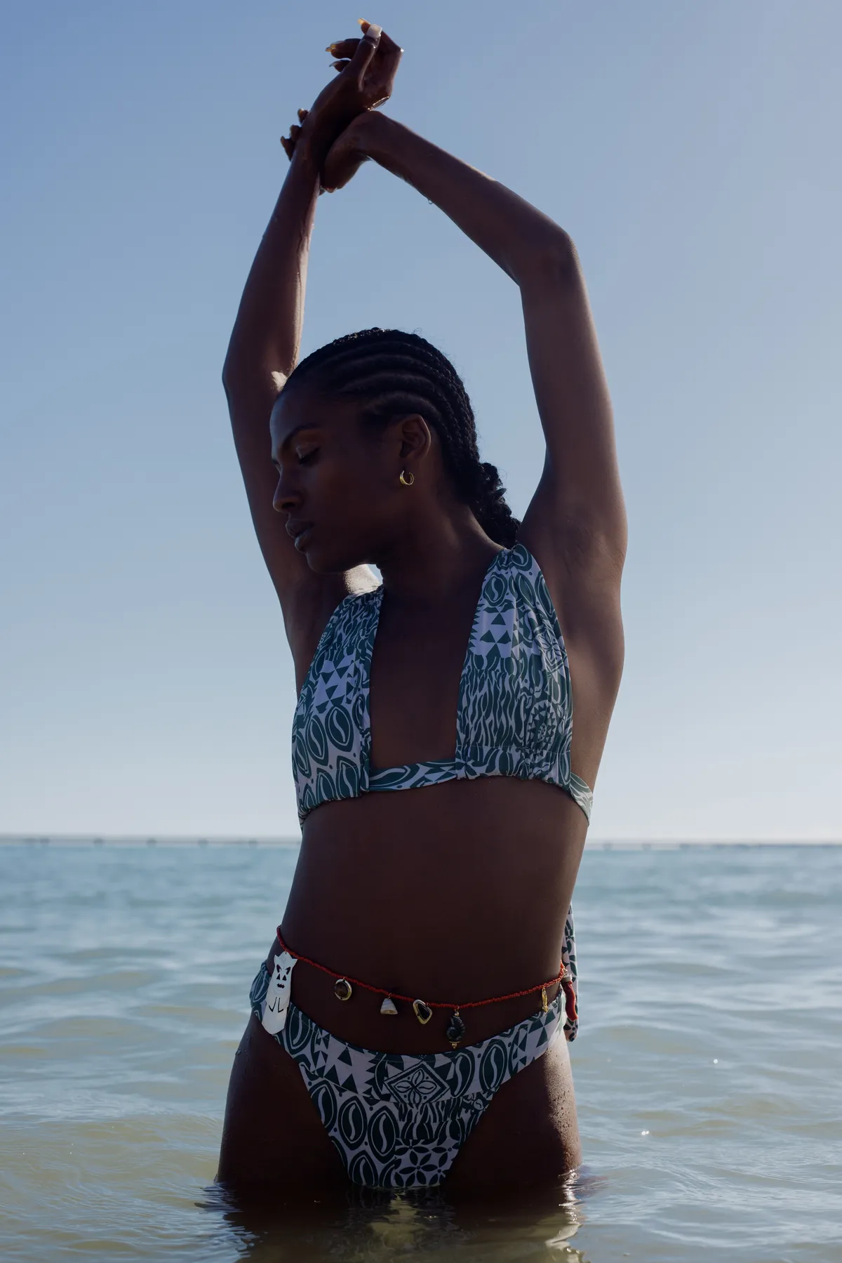 Top cortininha alongado, proporcionando sustentação. Alças de faixas largas, que permitem diversas formas de amarrações. Regulador nas costas para adaptar a diversas larguras. Não possui bojo bojo. Modelagem versátil, transita entre a praia e em ocasiões urbanas. Coleção Deságua — Alberto Pitta + Mahina. Estampa autoral do artista plástico baiano Alberto Pitta.
