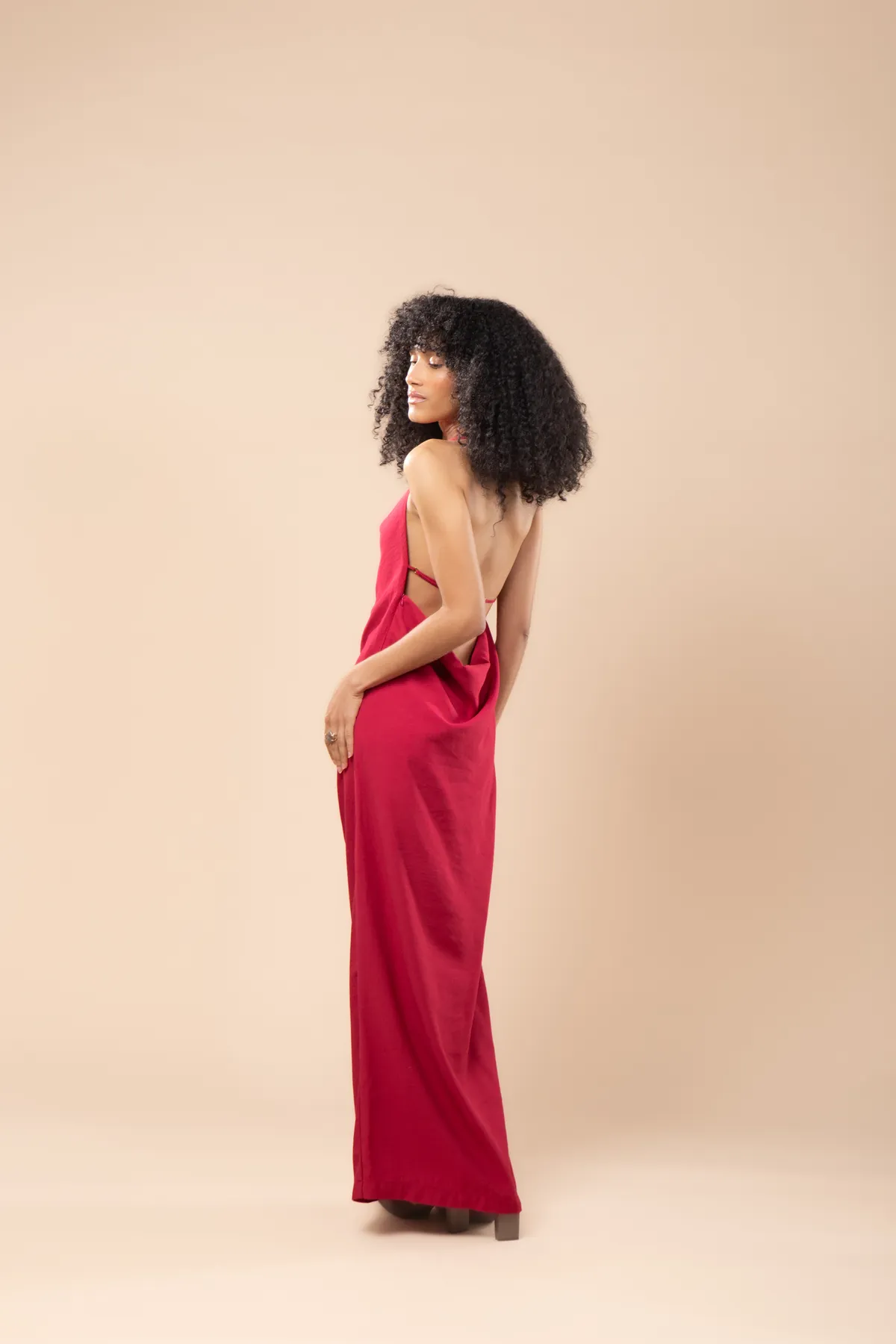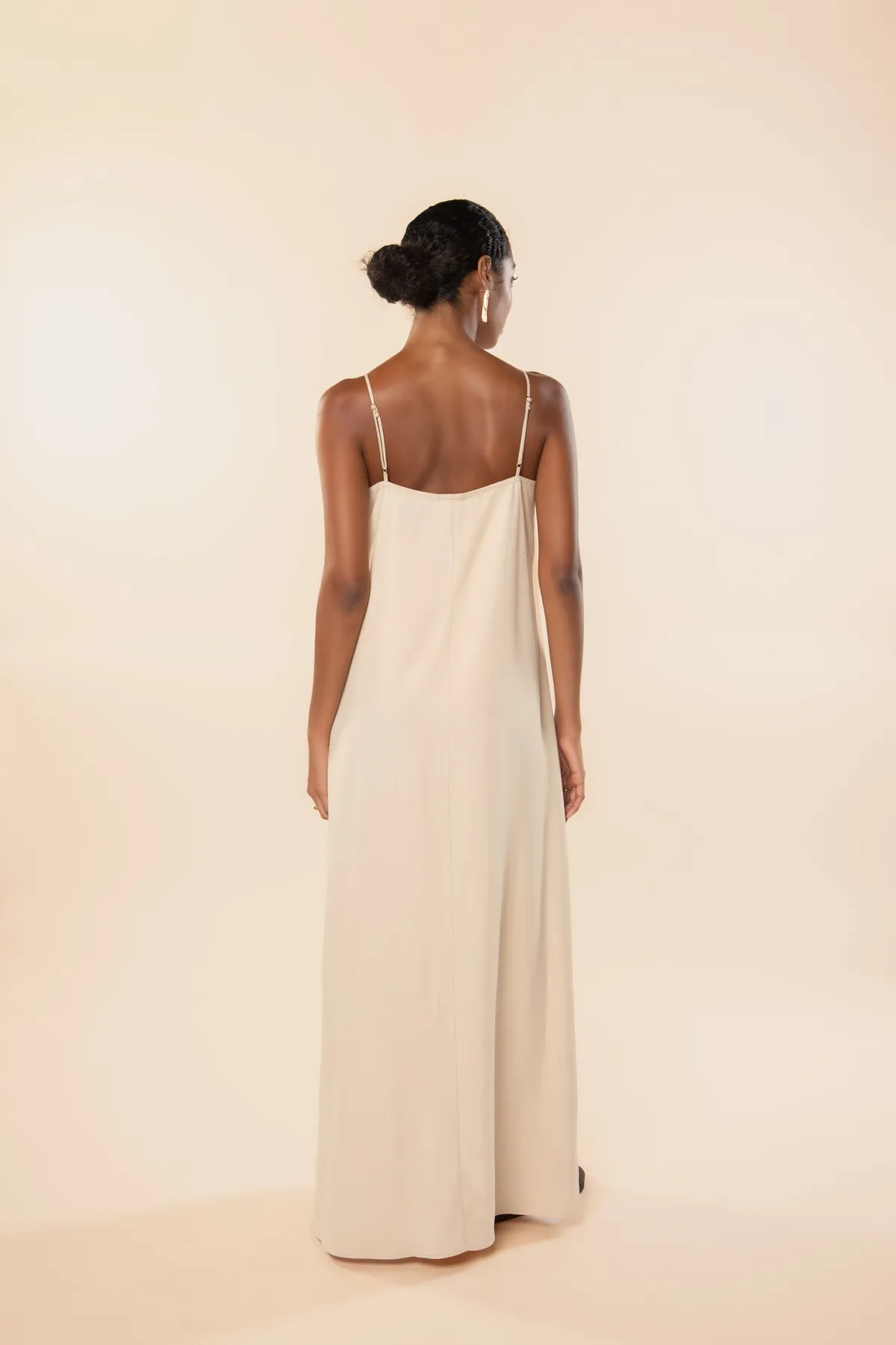 Vestido longo de sobrepor, com decote amplo na frente e costas, mostrando a peça de baixo. Possui fendas laterais. Alças ajustáveis com regulador em banho ouro.